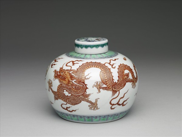 小圓口,短頸,圓腹,平底凹足。帶平頂圓蓋。頸部點紋,器肩及底邊各繪綠彩蓮瓣一周。罐腹外壁繪飾紅彩龍鳳戲珠紋。蓋面亦飾一團菊花與卷枝葉,蓋周則為花卉紋。底雙方框青花書「大清康熙年製」雙行六字楷款。