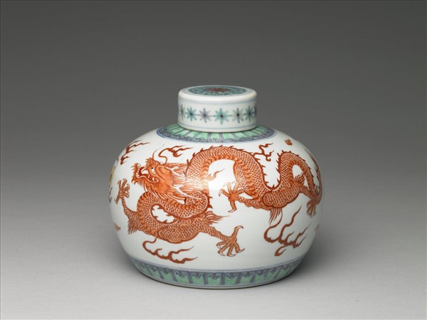 小圓口,短頸,圓腹,平底凹足。帶平頂圓蓋。頸部點紋,器肩及底邊各繪綠彩蓮瓣一周。罐腹外壁繪飾紅彩龍鳳戲珠紋。蓋面亦飾一團菊花與卷枝葉,蓋周則為花卉紋。底雙方框青花書「大清康熙年製」雙行六字楷款。