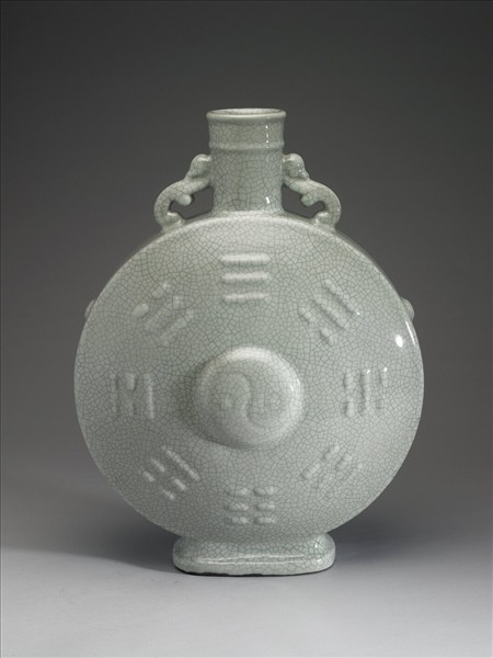 器呈扁圓形,直口,雙螭耳,圓角長方形圈足。頸部有一道凸弦紋,腹部兩面中央模印太極,周圍飾一圈八卦,腹兩側各飾二乳丁紋;全器施仿哥釉青瓷釉,呈灰青色,釉表滿佈深色開片紋。足底緣塗護胎汁,呈鐵黑色,底以青花書「大清雍正年製」三行六字篆款。