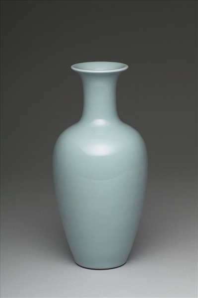 撇口,長頸,斜肩,斂腹,矮圈足。全器施仿汝青瓷釉,器表釉面滿佈淡褐色細密開片紋。圈足底緣周邊呈褐色,底以青花書「大清乾隆年製」六字三行篆書款。