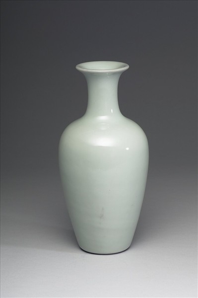 撇口,長頸,斜肩,歛腹,矮圈足。全器施仿汝青瓷釉,器表釉面滿佈淡褐色細密開片紋。圈足底緣周邊呈褐色,底以青花書「大清乾隆年製」六字三行篆書款。