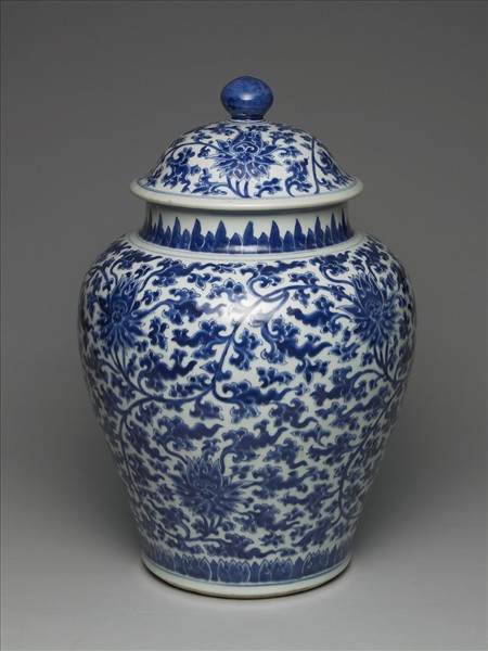 蓋罐,圓口略侈,圓唇。短直頸,豐肩下斂,平底微凹,帶寶珠鈕笠形子母口蓋。全器以鈷藍畫花,青花呈色濃艷,餘罩施白色釉,釉色勻淨。蓋外自青花鈕下畫弦紋兩道,蓋面彩繪三朵轉枝番蓮花葉紋,蓋沿飾弦紋兩道。罐口沿畫弦紋一道,頸及底邊分飾蓮瓣紋一周,折肩處與底邊各繪有弦紋兩道。腹部飾轉枝番蓮花紋,其餘隙地滿佈如卷草般的葉紋。器口圓唇多處有傷露胎,底外無釉露白胎,有轆轤痕。