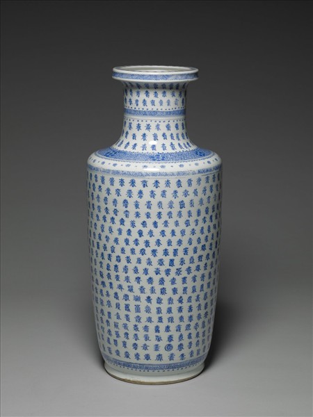 盤口,長直頸,豐肩平出,直筒長腹略外鼓,圈足。整器以不同字體的「壽」字為裝飾主調,只在頸部中段、頸肩交界、近足處以回紋、卍字錦、圓點紋等紋飾帶區隔出「壽」字的書寫空間,可知本器的製作目的為「祝壽」一類的祈願祝福。底外以釉下鈷藍料畫雙圈,但圈中無款識。