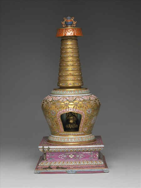 藏式塔,分段燒成後黏合。橘紅地描金朵雲紋寶蓋;塔身為金地多彩繪金番蓮紋及朵花紋,並繪獸面與瓔珞紋,龕門以卷葉紋框邊,龕底飾蓮瓣紋;須彌方座,飾紅色地彩繪卷枝朵花紋,轉折飾蓮瓣紋,下緣仿繪如意雲足。龕內有金銅佛一尊。