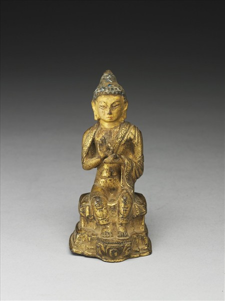 銅佛,螺髮高髻,身披袈裟,雙手曲抬至胸前,如結說法印。垂腳坐,座前蓮花一朵恰承雙足踏處。