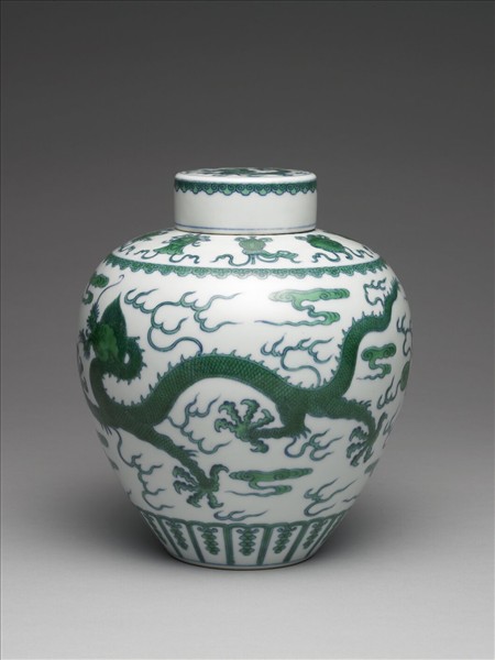 斂口,短頸,豐肩,斂腹,凹足,帶平頂蓋一。蓋及壺身皆由青花勾畫紋飾之輪廓線、再填彩。在壺腹兩側各畫一行龍,龍身成波曲狀行走,在青花輪廓線內填以綠釉彩,在龍的周間畫火焰紋及朵雲紋,罐肩飾一圈佛教八吉祥及如意雲紋邊飾,腹下為蓮瓣紋飾,蓋面寬平,繪有一龍及火珠紋,隙地飾火焰紋,蓋緣邊點以如意雲紋。底以青花書「大清乾隆年製」六字三行篆款。