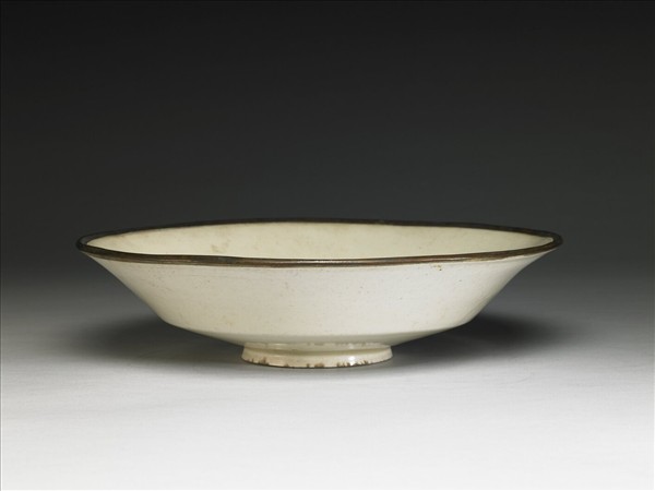 撇口,淺壁,折腰,器裡折腰痕明顯,底寬平微凹下,小矮圈足。全器薄胎滿釉,色呈牙白,通裡劃花為飾,淺劃雙鳧蓮花紋,一對水禽伴游於水塘的景致,勾勒簡約優雅。紋飾同使用痕而不甚清晰。覆燒成器,口沿無釉,鑲銅釦稜。