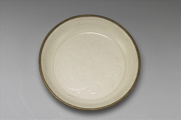 侈口,淺壁,平底。全器滿釉,色牙白。以劃花為飾,內底淺劃蓮荷一支。採覆燒法燒製,於口沿無釉處鑲銅釦稜。