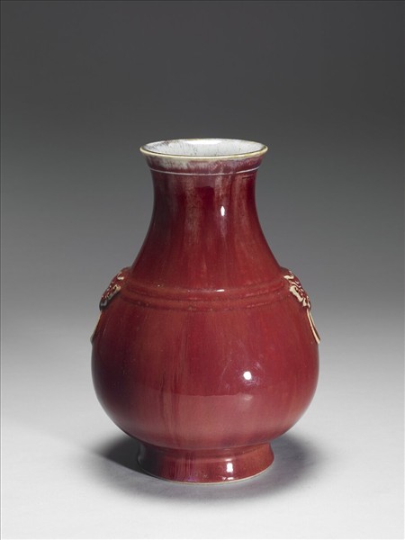 侈口,短頸,斜肩,雙獸首啣環耳,垂腹,外撇接圈足。肩部飾兩道凸弦紋,全器施仿鈞紅釉,器內施白釉,印款「雍正年製」四字雙行篆款。從唐英〈陶成記事碑〉記載可知仿鈞窯窯變釉為雍正官窯致力燒造的品目之一,仿鈞釉過程採多次施釉,燒成過程中,不同金屬元素自然結合,使器表釉彩出現自然流淌現象。