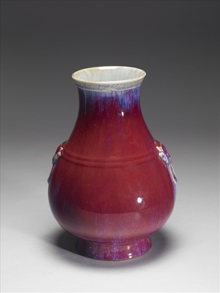 侈口,短頸,斜肩,雙獸首啣環耳,垂腹,外撇接圈足。肩部飾兩道凸弦紋,全器施仿鈞紅釉,器內施白釉,印款「雍正年製」四字雙行篆款。從唐英〈陶成記事碑〉記載可知仿鈞窯窯變釉為雍正官窯致力燒造的品目之一,仿鈞釉過程採多次施釉,燒成過程中,不同金屬元素自然結合,使器表釉彩出現自然流淌現象。