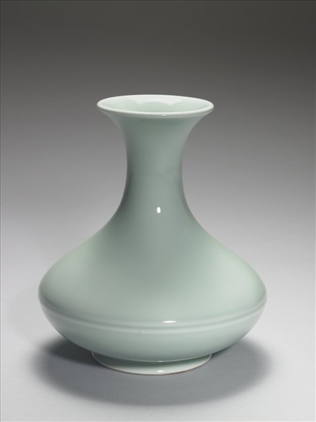 喇叭口,長頸,斜肩,扁腹,圈足,造型略似康熙時期的荸薺扁瓶。全器施青釉,色呈冬青色,腹部飾兩道凸弦紋。足底緣露胎,胎色漂白,底施青釉,以青花書「大清雍正年製」六字三行篆款。