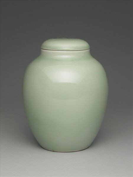 圓口,深腹,平底,帶一圓頂子母口蓋,兩側各飾一月牙形裝飾。全器施青釉,色呈冬青色,釉色均勻,足底緣露胎。無款。