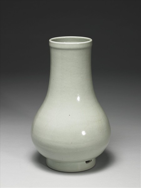 廣口,折唇棱,直長頸,斜肩,垂腹,圈足。全器施青釉,呈豆青色,釉面密佈淺色開片紋,圈足兩側各有一長方圓孔。足底露胎,塗赭色護胎汁。底有青花書「大清雍正年製」六字三行篆書款。