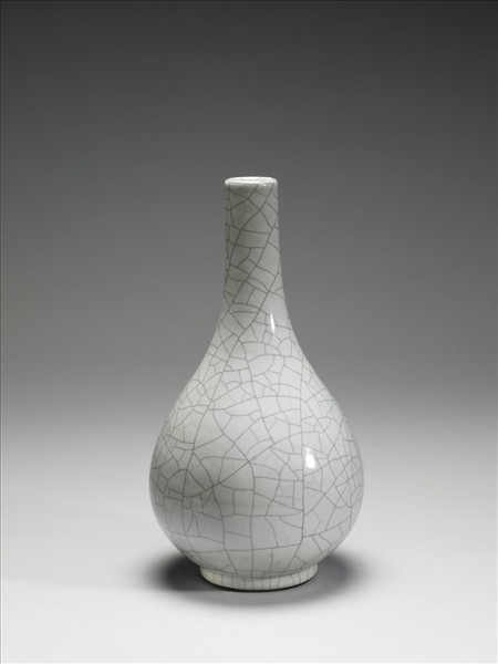 小口,細長頸,梨形圓腹,圈足。全器施淺青色仿哥釉,釉面佈滿褐色開片紋。底部露胎,塗鐵黑色護胎汁,底部有青花書「大清雍正年製」六字三行篆書款。