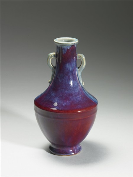 唇口,長頸,雙耳,折肩,腹部下斂,撇足。通體施鈞紅釉,呈紅、靛、紫、月白等多色深淺混雜流動窯變釉,口內與雲形板耳則多作淺月白藍色。器底施醬釉,底心印「大清乾隆年製」六字三行篆款,圈足露胎,塗赭色汁。仿鈞窯變釉為雍正時出現的新品種,係仿鈞釉色繁衍而來,採多次施釉,燒成過程中,不同金屬元素自然結合。所產生的流動窯變釉色,一般偏紅者,稱「火焰紅」。