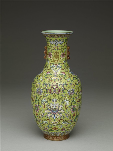 撇口直頸,深壁碩腹,圈足,頸部飾棱脊雙耳。器內施湖綠色釉,口緣描金一圈。器外壁以綠地釉為地,彩繪纏枝番蓮紋,腹外壁及頸部飾小花、藍色蝙蝠與金彩「壽」字。腹外壁另繪飾桃實、與楷書「福」字,近足處飾蓮瓣紋一圈。足牆外繪紅地回紋,足內施湖綠色釉,方形白釉地以紅彩書「大清嘉慶年製」三行六字篆款。