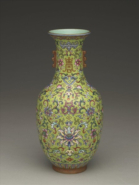撇口直頸,深壁碩腹,圈足,頸部飾棱脊雙耳。器內施湖綠色釉,口緣描金一圈。器外壁以綠地釉為地,彩繪纏枝番蓮紋,腹外壁及頸部飾小花、藍色蝙蝠與金彩「壽」字。腹外壁另繪飾桃實、與楷書「福」字,近足處飾蓮瓣紋一圈。足牆外繪紅地回紋,足內施湖綠色釉,方形白釉地以紅彩書「大清嘉慶年製」三行六字篆款。