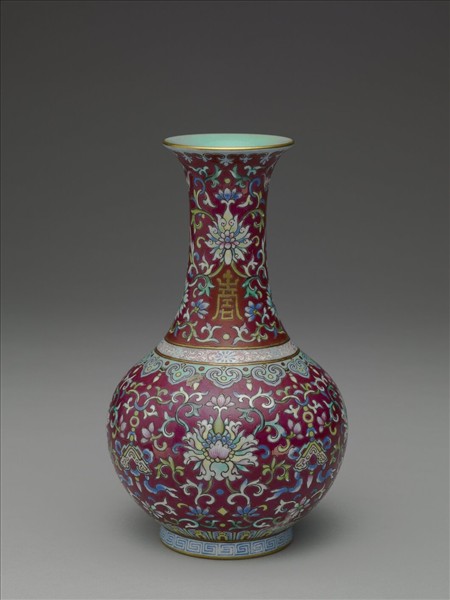 撇口直頸,深壁碩腹,圈足。器內施湖綠色釉,口緣描金一圈。器外壁以紫紅釉為地,彩繪纏枝番蓮紋,頸外壁飾蝙蝠啣「卍」字、金彩「壽」字,番蓮花心中並見有「吉」字紋樣。腹外壁亦飾磬紋。頸肩交界處繪白地藍花紅卷草一周。足牆外壁描繪白地藍彩回紋,足內施湖綠色釉,方形白釉地以紅彩書「大清嘉慶年製」三行六字篆款。