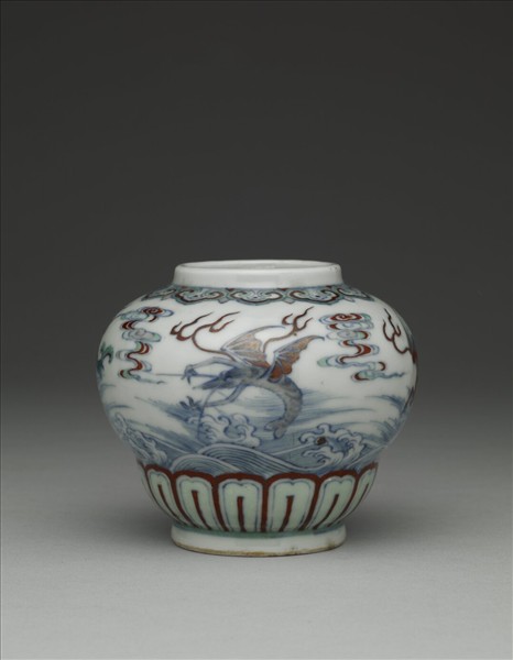 罐,斂圓口,短頸,肩部豐圓,斂腹,圈足。全器紋飾用釉下青花勾勒輪廓線,再加填紅、綠、黃諸彩。腹外壁以直升之祥雲將空間分隔為四等分,每個空間中皆繪異獸一隻飛翔於海水波濤之上,其異獸或如龍、馬、蝦而有翅,或自蚌殼中猙獰而出。口下飾如意雲頭紋一圈、腹外壁近底處一圈蓮瓣紋。圈足內施白釉,以青花書一「天」字楷款。