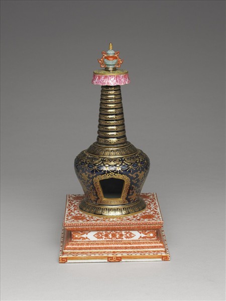 藏式塔,分段燒成後黏合。湖綠寶瓶頂,粉紅地朵雲紋寶蓋;塔身為霽青地描金番蓮紋及朵花紋,並繪獸面與瓔珞紋,龕門以卷葉紋框邊,龕底飾蓮瓣紋;須彌方座,飾白色地紅彩繪卷枝番蓮紋及朵花紋,轉折飾蓮瓣紋,下緣仿繪如意雲足;座足底露胎,塗護胎汁,底內凹施湖綠釉,中央有圓孔,可見圓形湖綠釉塔底。