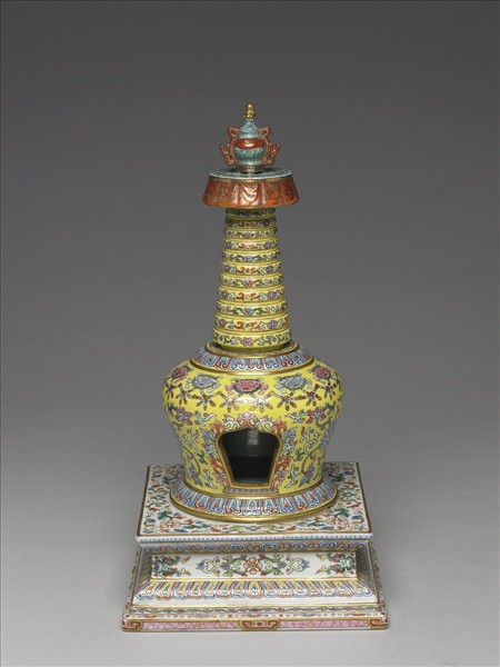 藏式塔,分段燒成後黏合。湖綠寶瓶頂,紅地描金朵雲紋寶蓋;塔身為黃地鉤邊彩繪番蓮紋及朵花紋,並繪獸面與瓔珞紋,龕門以卷葉紋框邊,龕底飾蓮瓣紋;須彌方座,飾白色地彩繪卷枝朵花紋,轉折飾蓮瓣紋,下緣仿繪如意雲足;座足底露胎,塗護胎汁,底內凹施湖綠釉,中央有孔上方下圓,可見圓形湖綠釉塔底。