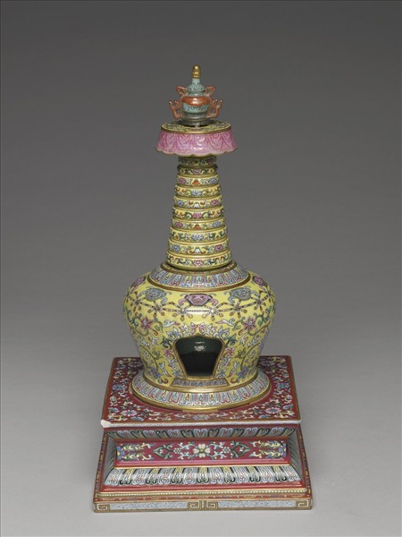 藏式塔,分段燒成後黏合。湖綠寶瓶頂,粉紅地朵雲紋寶蓋;塔身為黃地鉤邊彩繪番蓮紋及朵花紋,並繪獸面與瓔珞紋,龕門以卷葉紋框邊,龕底飾蓮瓣紋;須彌方座,飾紫紅色地彩繪卷枝朵花紋,轉折飾蓮瓣紋,下緣仿繪如意雲足;座足底露胎,塗護胎汁,底內凹施湖綠釉,中央有孔上方下圓,可見圓形湖綠釉塔底。
