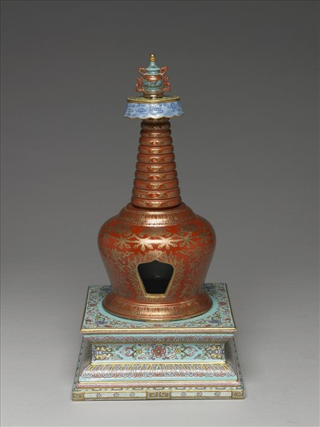 藏式塔,分段燒成後黏合。湖綠寶瓶頂,淺藍地朵雲紋寶蓋;塔身為磚紅地描金番蓮紋及朵花紋,並繪獸面與瓔珞紋,龕門以卷葉紋框邊,龕底飾蓮瓣紋;須彌方座,飾湖藍色地彩繪卷枝朵花紋,轉折飾蓮瓣紋,下緣仿繪如意雲足;座足底露胎,塗護胎汁,底內凹施湖綠釉,中央有孔上方下圓,可見圓形湖綠釉塔底。