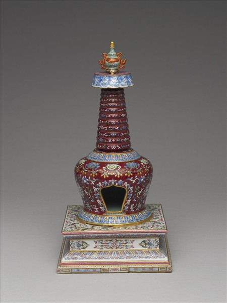 藏式塔,分段燒成後黏合。湖綠寶瓶頂,白地朵雲紋寶蓋;塔身為紫紅地鉤邊彩繪番蓮紋及朵花紋,並繪獸面與瓔珞紋,龕門以卷葉紋框邊,龕底飾蓮瓣紋;須彌方座,飾白色地彩繪卷枝朵花紋,轉折飾蓮瓣紋,下緣仿繪如意雲足;座足底露胎,塗護胎汁,底內凹施湖綠釉,中央有孔上方下圓,可見圓形湖綠釉塔底。