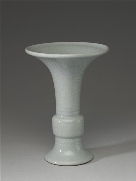 觚式瓷瓶,仿銅器觚形,喇叭口,長頸,扁圓腹,腹下端外撇,矮撇足。頸與脛部各飾二道凸弦紋。全器施粉青色仿汝釉,釉面上有細密淺赭色開片裂紋;圈足露胎塗赭色汁一圈,圈足內青釉地青花書「大清乾隆年製」三行六字篆款。
