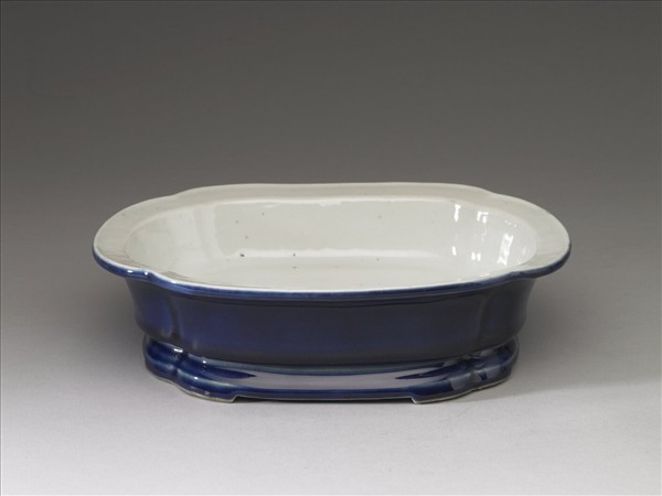 海棠花形盆,作四瓣海棠花形,廣口折沿,淺壁依隨海棠花形變化,平底,下接海棠花形圈足。外壁施藍釉,盆內及底均施白釉,器底有墨書。