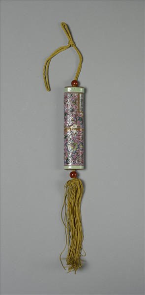 瓷牙籤筒,筒作扁圓形,中空以裝牙籤,外壁以粉彩繪飾圖樣。一端可打開為器蓋,蓋上穿繩,接貫器底,出為絲穗。如此作法,便可固定、調整器蓋的開闔。整器外型模仿已收束齊整之畫卷,故器外壁中央繪有金線繞旋與牙白色別子,兩端白地綠回紋一圈以示手卷之鑲邊。除此之外,外壁則以粉紅地纏枝番蓮為飾,有如一卷包首華麗的手卷。又右上有長方形金框榜題,作黑色「萬壽無疆」四篆字,或是為了祝壽而製作此器。