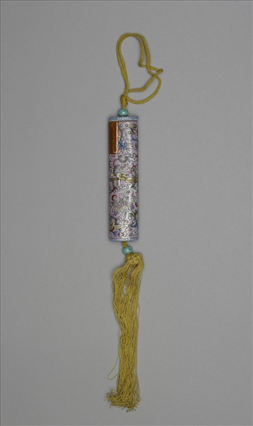 瓷牙籤筒,筒作扁圓形,中空以裝牙籤,外壁以粉彩繪飾圖樣。一端可打開為器蓋,蓋上穿繩,接貫器底,出為絲穗。如此作法,便可固定、調整器蓋的開闔。整器外型模仿已收束齊整之畫卷,故器外壁中央繪有金線繞旋與牙白色別子,兩端白地綠回紋一圈以示手卷之鑲邊。除此之外,外壁則以粉紅地纏枝番蓮為飾,有如一卷包首華麗的手卷。又右上有長方形金框榜題,作黑色「萬壽無疆」四篆字,或是為了祝壽而製作此器。