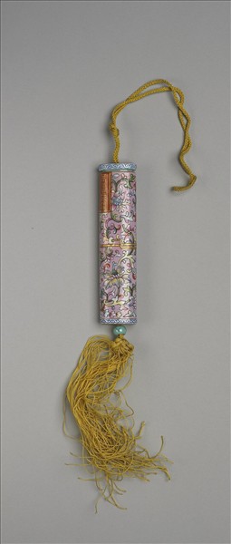 瓷牙籤筒,筒作扁圓形,中空以裝牙籤,外壁以粉彩繪飾圖樣。一端可打開為器蓋,蓋上穿繩,接貫器底,出為絲穗。如此作法,便可固定、調整器蓋的開闔。整器外型模仿已收束齊整之畫卷,故器外壁中央繪有金線繞旋與牙白色別子,兩端白地綠回紋一圈以示手卷之鑲邊。除此之外,外壁則以粉紅地纏枝番蓮為飾,有如一卷包首華麗的手卷。又右上有長方形金框榜題,作黑色「萬壽無疆」四篆字,或是為了祝壽而製作此器。