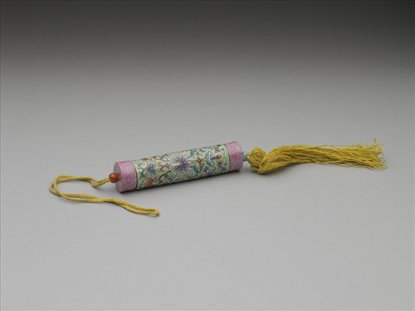 瓷牙籤筒,作圓筒形,中空以裝牙籤,外壁以琺瑯彩繪飾圖樣。一端可打開為器蓋,蓋上穿繩,接貫器底,出為絲穗。如此作法,便可固定、調整器蓋的開闔。整器外型模仿已捲起之畫卷,兩端白地粉紅色卷草花葉以示軸頭,其花朵等距布列,隙地填飾卷草。除此之外,外壁繪湖藍地纏枝番蓮、蝙蝠為飾,蝙蝠張翅在上,頭尾蔓出卷草,並與滿覆器壁的纏枝番蓮相接連,蝙蝠前方又飾有金彩「卍」字,其雖是模擬織繡繁麗的包首綾錦,但由裝飾的蝙蝠、「卍」字看來,其裝飾製作只藉手卷之形,而真意在表現吉祥意涵。