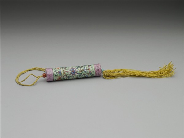 瓷牙籤筒,作圓筒形,中空以裝牙籤,外壁以琺瑯彩繪飾圖樣。一端可打開為器蓋,蓋上穿繩,接貫器底,出為絲穗。如此作法,便可固定、調整器蓋的開闔。整器外型模仿已捲起之畫卷,兩端白地粉紅色卷草花葉以示軸頭,其花朵等距布列,隙地填飾卷草。除此之外,外壁繪湖藍地纏枝番蓮、蝙蝠為飾,蝙蝠張翅在上,頭尾蔓出卷草,並與滿覆器壁的纏枝番蓮相接連,蝙蝠前方又飾有金彩「卍」字,其雖是模擬織繡繁麗的包首綾錦,但由裝飾的蝙蝠、「卍」字看來,其裝飾製作只藉手卷之形,而真意在表現吉祥意涵。