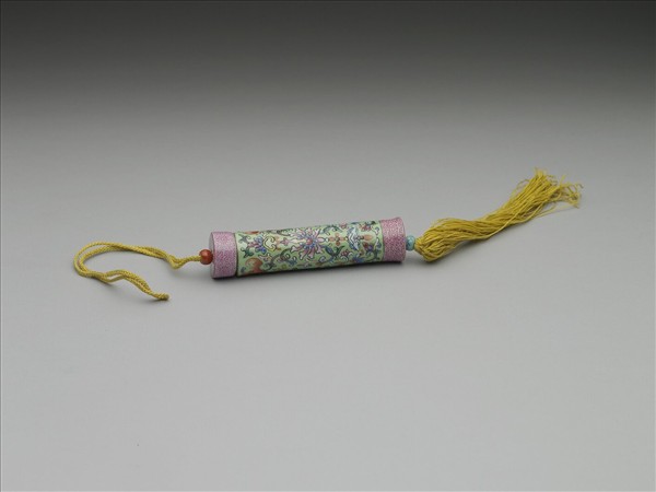 瓷牙籤筒,作圓筒形,中空以裝牙籤,外壁以琺瑯彩繪飾圖樣。一端可打開為器蓋,蓋上穿繩,接貫器底,出為絲穗。如此作法,便可固定、調整器蓋的開闔。整器外型模仿已捲起之畫卷,兩端白地粉紅色卷草花葉以示軸頭,其花朵等距布列,隙地填飾卷草。除此之外,外壁繪湖藍地纏枝番蓮、蝙蝠為飾,蝙蝠張翅在上,頭尾蔓出卷草,並與滿覆器壁的纏枝番蓮相接連,蝙蝠前方又飾有金彩「卍」字,其雖是模擬織繡繁麗的包首綾錦,但由裝飾的蝙蝠、「卍」字看來,其裝飾製作只藉手卷之形,而真意在表現吉祥意涵。