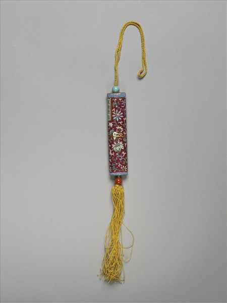 瓷牙籤筒,筒作扁圓形,中空以裝牙籤,外壁以琺瑯彩繪飾圖樣。一端可打開為器蓋,蓋上穿繩,通貫器底,出為絲穗。兩端各有一瓷珠,如此作法,便可固定、調整器蓋的開闔。整器外型模仿已收束齊整之畫卷,故器外壁中央繪有金線繞旋與牙白色別子,兩端白地藍色卷草回紋一圈以示手卷之鑲邊。除此之外,外壁滿飾紅地纏枝番蓮,有如一卷包首華麗的手卷。又右上有長方形金框榜題,作黑色「萬壽無疆」四篆字,或是為了祝壽而製作此器。