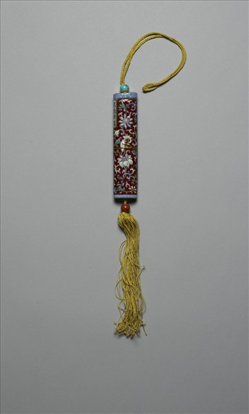 瓷牙籤筒,筒作扁圓形,中空以裝牙籤,外壁以琺瑯彩繪飾圖樣。一端可打開為器蓋,蓋上穿繩,通貫器底,出為絲穗。兩端各有一瓷珠,如此作法,便可固定、調整器蓋的開闔。整器外型模仿已收束齊整之畫卷,故器外壁中央繪有金線繞旋與牙白色別子,兩端白地藍色卷草回紋一圈以示手卷之鑲邊。除此之外,外壁滿飾紅地纏枝番蓮,有如一卷包首華麗的手卷。又右上有長方形金框榜題,作黑色「萬壽無疆」四篆字,或是為了祝壽而製作此器。