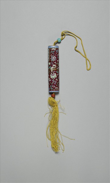 瓷牙籤筒,筒作扁圓形,中空以裝牙籤,外壁以琺瑯彩繪飾圖樣。一端可打開為器蓋,蓋上穿繩,通貫器底,出為絲穗。兩端各有一瓷珠,如此作法,便可固定、調整器蓋的開闔。整器外型模仿已收束齊整之畫卷,故器外壁中央繪有金線繞旋與牙白色別子,兩端白地藍色卷草回紋一圈以示手卷之鑲邊。除此之外,外壁滿飾紅地纏枝番蓮,有如一卷包首華麗的手卷。又右上有長方形金框榜題,作黑色「萬壽無疆」四篆字,或是為了祝壽而製作此器。