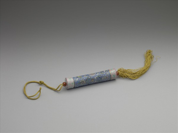 瓷牙籤筒,作圓筒形,中空以裝牙籤,外壁以琺瑯彩繪飾圖樣。一端可打開為器蓋,蓋上穿繩,通貫器底,出為絲穗,兩端各有一瓷珠。如此作法,便可固定、調整器蓋的開闔。整器外型模仿已捲起之畫卷,兩端白地卷草花葉以示軸頭,其淺綠花朵等距布列,隙地填飾紅色卷草。除此之外,外壁滿繪藍地纏枝番蓮飾,花葉間並見金彩「卍」字,其雖是模擬織繡繁麗的包首綾錦,但由「卍」裝飾字看來,其裝飾製作只藉手卷之形,而真意在表現吉祥意涵。