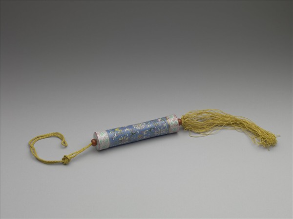 瓷牙籤筒,作圓筒形,中空以裝牙籤,外壁以琺瑯彩繪飾圖樣。一端可打開為器蓋,蓋上穿繩,通貫器底,出為絲穗,兩端各有一瓷珠。如此作法,便可固定、調整器蓋的開闔。整器外型模仿已捲起之畫卷,兩端白地卷草花葉以示軸頭,其淺綠花朵等距布列,隙地填飾紅色卷草。除此之外,外壁滿繪藍地纏枝番蓮飾,花葉間並見金彩「卍」字,其雖是模擬織繡繁麗的包首綾錦,但由「卍」裝飾字看來,其裝飾製作只藉手卷之形,而真意在表現吉祥意涵。