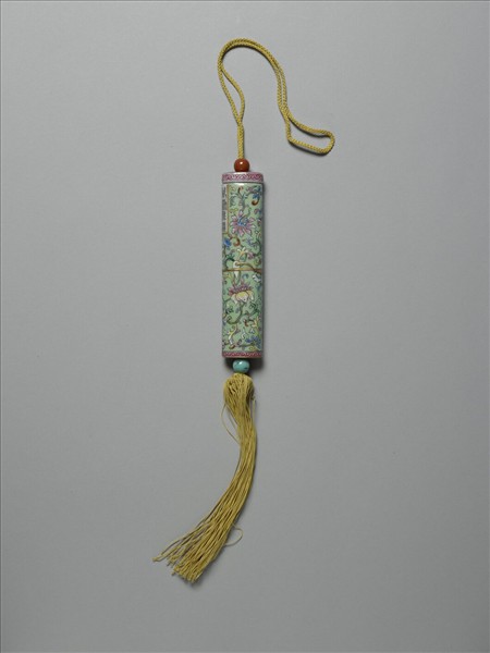 瓷牙籤筒,筒作扁圓形,中空以裝牙籤。外壁以琺瑯彩繪紋樣。一端可打開為器蓋,蓋上穿繩,通貫器底,出為絲穗。兩端各繫一瓷珠,透過瓷珠上下的移動,可調整器蓋的開闔。整器外型模仿已收束齊整之畫卷,故器外壁中央繪有金線繞旋與牙白色別子,兩端粉紅色卷草一圈以示手卷之鑲邊。除此之外,外壁則以淺綠地纏枝番蓮為飾,有如一卷包首華麗的手卷。又左上有長方形金框榜題,作黑色「萬壽無疆」四篆字,或是為了祝壽而製作此器。