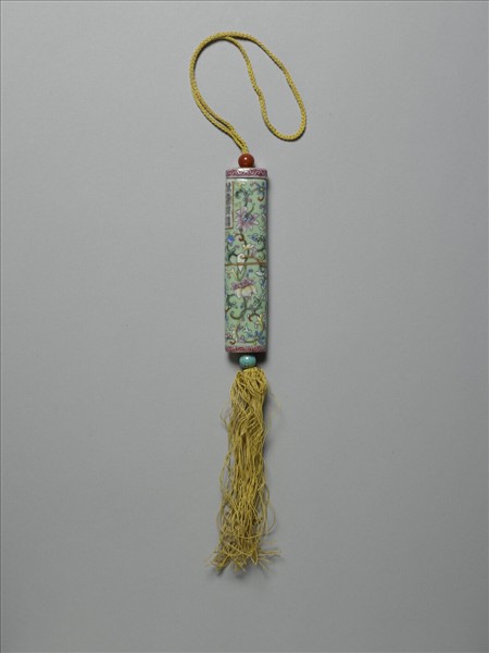 瓷牙籤筒,筒作扁圓形,中空以裝牙籤。外壁以琺瑯彩繪紋樣。一端可打開為器蓋,蓋上穿繩,通貫器底,出為絲穗。兩端各繫一瓷珠,透過瓷珠上下的移動,可調整器蓋的開闔。整器外型模仿已收束齊整之畫卷,故器外壁中央繪有金線繞旋與牙白色別子,兩端粉紅色卷草一圈以示手卷之鑲邊。除此之外,外壁則以淺綠地纏枝番蓮為飾,有如一卷包首華麗的手卷。又左上有長方形金框榜題,作黑色「萬壽無疆」四篆字,或是為了祝壽而製作此器。