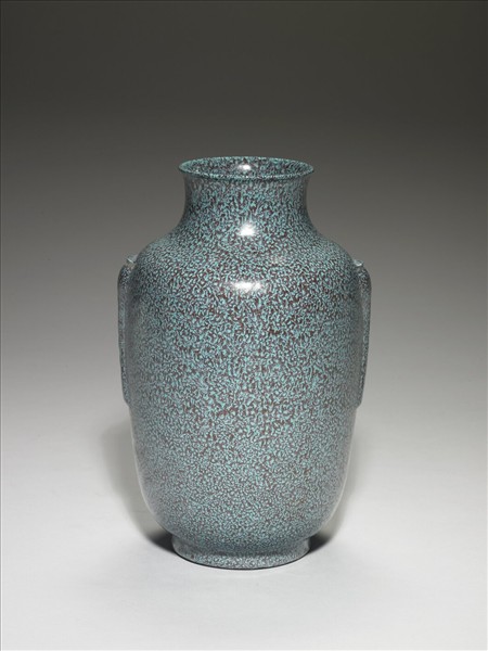 小口帶撇,收頸寬肩,碩腹,矮圈足。雙肩處以貼花作二瓶狀式凸起,為暗耳。全器施爐鈞釉,色深藍帶深淺變化,有藍點,光采晶亮,凝重典雅。圈足露胎處繪深棕色,底部模印「大清乾隆年製」六字三行篆款。爐鈞釉為低溫釉,先以高溫燒就素胎,再於胎上施釉低溫烘烤。