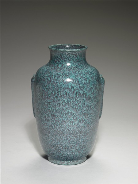小口帶撇,收頸寬肩,碩腹,矮圈足。雙肩處以貼花作二瓶狀式凸起,為暗耳。全器施爐鈞釉,色深藍帶深淺變化,有藍點,光采晶亮,凝重典雅。圈足露胎處繪深棕色,底部模印「大清乾隆年製」六字三行篆款。爐鈞釉為低溫釉,先以高溫燒就素胎,再於胎上施釉低溫烘烤。