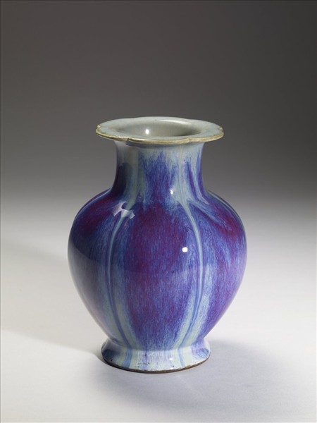 六瓣花形口,寬直頸,鼓腹,圈足外撇。器表有六道棱紋,通體施鈞紅釉,呈紅、靛、紫、月白等多色深淺混雜流動窯變釉。器底施醬釉,底心印「大清乾隆年製」六字三行篆款,圈足露胎,塗赭色汁。仿鈞窯變釉為雍正時出現的新品種,係仿鈞釉色繁衍而來,採多次施釉,燒成過程中,不同金屬元素自然結合。所產生的流動窯變釉色,一般偏藍者,稱「火焰青」。