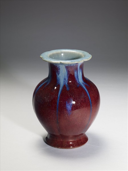 六瓣花形口,寬直頸,鼓腹,圈足外撇。器表有六道棱紋,通體施鈞紅釉,呈紅、靛、紫、月白等多色深淺混雜流動窯變釉。器底施醬釉,底心印「大清乾隆年製」六字三行篆款,圈足露胎,塗赭色汁。仿鈞窯變釉為雍正時出現的新品種,係仿鈞釉色繁衍而來,採多次施釉,燒成過程中,不同金屬元素自然結合。所產生的流動窯變釉色,一般偏紅者,稱「火焰紅」。
