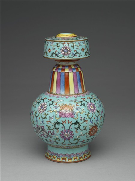 器頂形如平台傘蓋狀,頂面小圓口,階式頸,斜肩,圓腹,高外撇圈足,整器似無流之奔巴壺。全器湖藍多彩釉繪番蓮花和八吉祥圖案,口沿飾有紅色小點,傘蓋狀外壁裝飾卷枝花卉,頸部繪蓮瓣紋。腹部繪佛教八寶:寶瓶,寶傘,白蓋,盤長,金魚,法螺,蓮花,法輪等圖案,間飾纏枝番蓮紋,腹下飾一圈蓮瓣紋,圈足亦飾蓮瓣紋一周。足露胎一圈,內施湖藍釉,中央正方形白地紅彩書「大清乾隆年製」六字三行篆款。