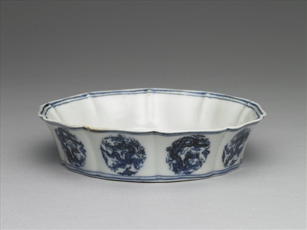 侈口,淺壁,內底心微拱,外底略凹,淺圈足。器外壁等距繪飾團龍紋十組。器內底飾一龍飛舞雲間,外加雙青線。足緣露胎一圈,無款識。