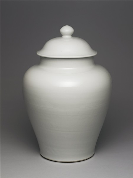 蓋罐。直口,短頸,豐肩,腹上豐下斂,脛部下緣微微外撇,平底,帶寶珠鈕笠形子母口蓋一。全器施白釉,釉色溫潤。底面無釉,塗淺褐色護胎汁,有轆轤痕;蓋沿內側裡有一墊圈痕,蓋底緣露胎,胎體為白色。